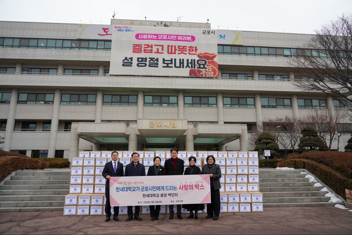 하은호 군포시장은 “명절을 앞두고 시민들의 위해 따뜻한 배려를 보내주신 한세대학교에 감사드린다”라며 “보내주신 소중한 마음이 각 가정에 잘 전달되어, 군포 시민 모두가 소외됨 없이 포근하고 행복한 설 명절을 보낼 수 있도록 행정적 지원을 아끼지 않겠다”라고 화답했다.