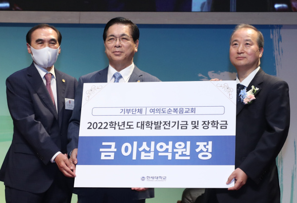 [국민일보 박재찬 기자] 여의도순복음교회(이영훈 목사)는 17일 한세대에 발전기금 20억원을 전달했다. 이영훈 목사는 이날 경기도 군포 한세대 대강당에서 열린 발전기금 전달식에서 “지금 우리는 코로나19와 세계적 기후 위기, 우크라이나 전쟁 등으로 시대의 전환기에 서 있다”면서 “이러한 때에 한세대가 거룩한 꿈과 희망을 품고 하나님의 대학으로 빛을 발해 달라”고 당부했다. 김정일 총장직무대행은 “발전기금을 디딤돌 삼아 변화와 혁신의 동력을 일으켜 기독교 명문 사학으로 거듭나겠다”고 고마움을 전했다.