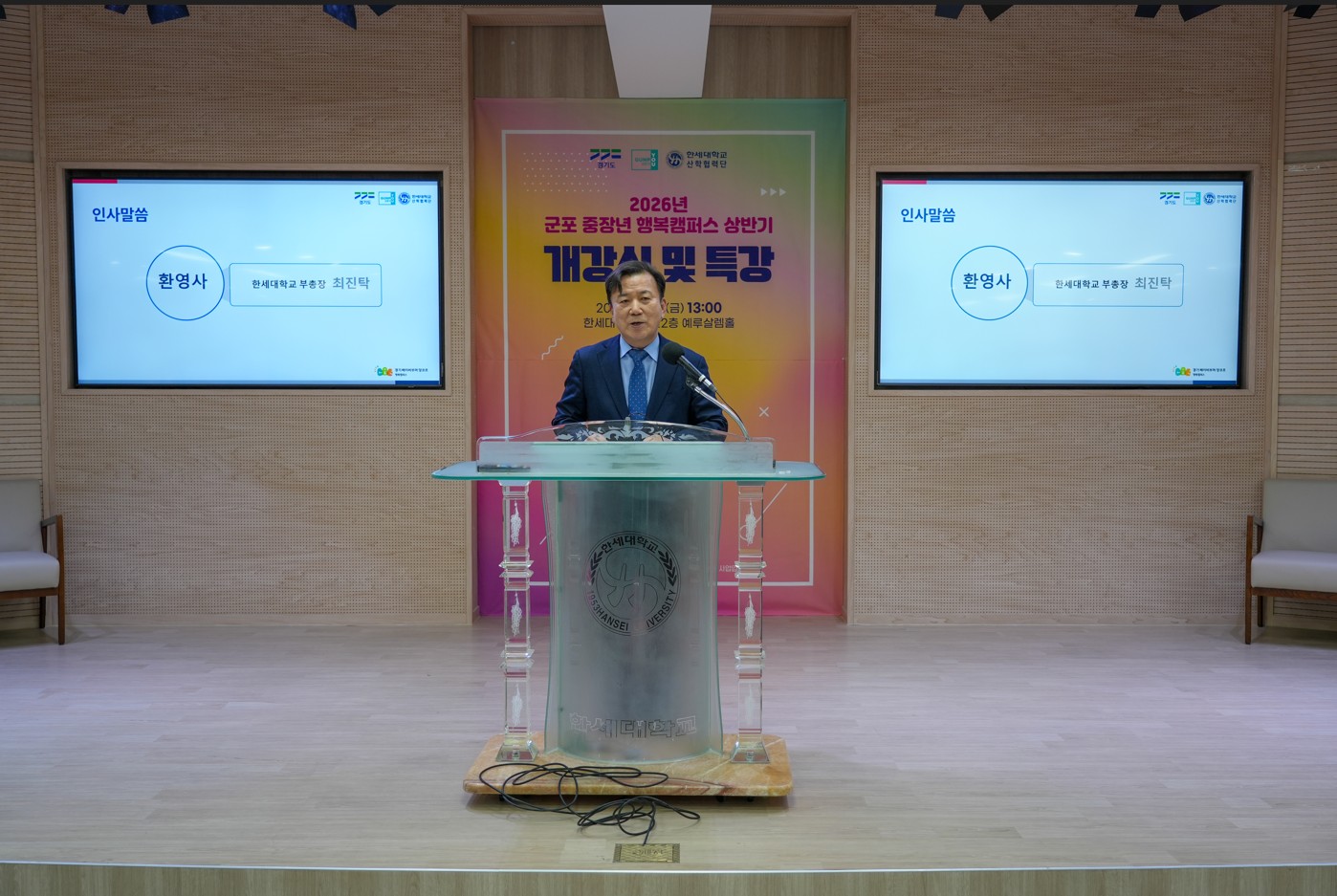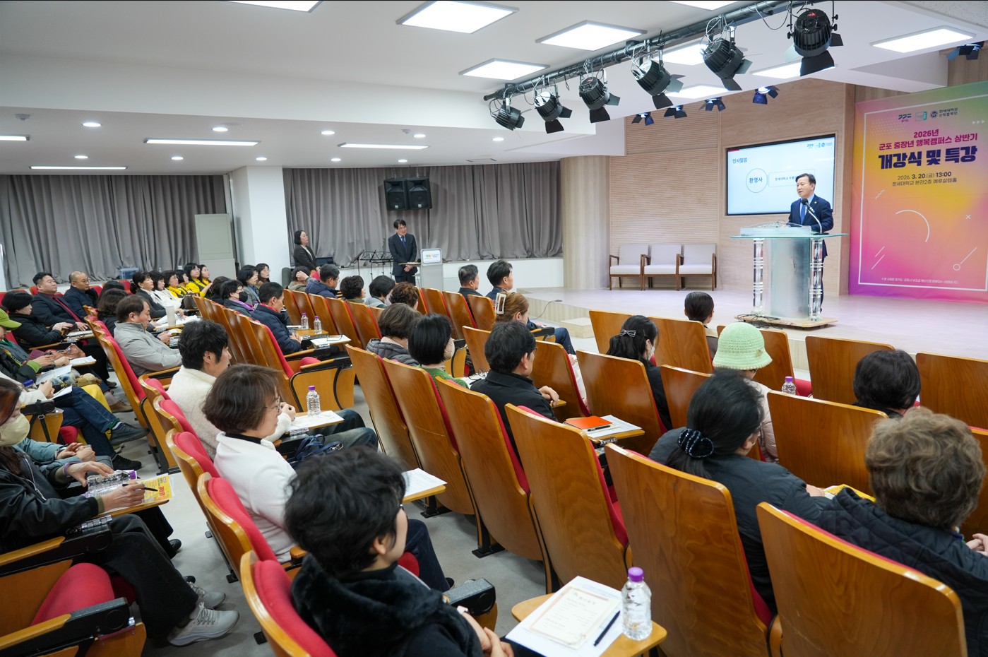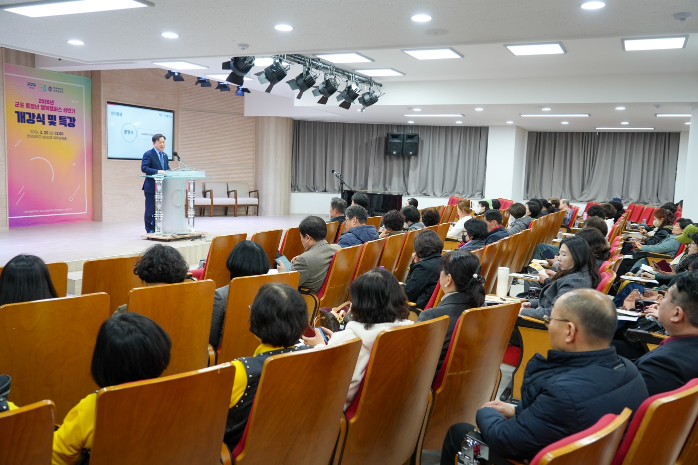 이날 개강 행사는 이경북 팀장(군포 중장년 행복캠퍼스)의 사회로 팬플릇 공연, 최진탁 부총장의 환영사, 하은호 군포시장의 축사 등에 이어 상반기 교육과정 안내 및 직전 학기 회고 동영상 시청 등의 순서로 진행되었고 개강식 이후에는 정상환 강사의 ‘2026년 핵심 트렌드’ 특강 순으로 이어졌다.