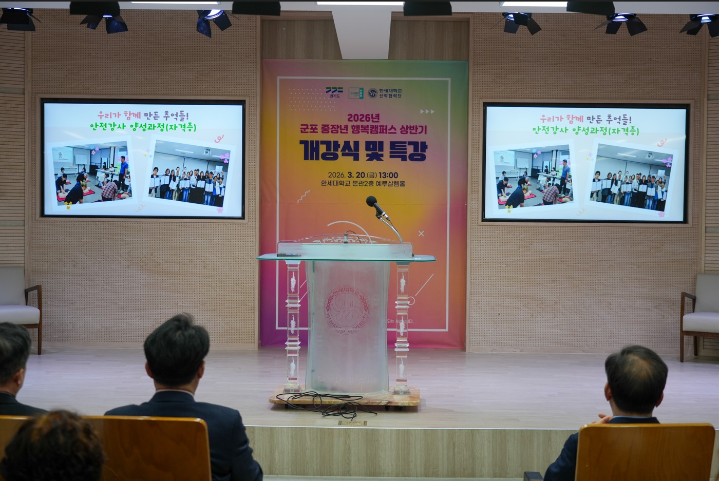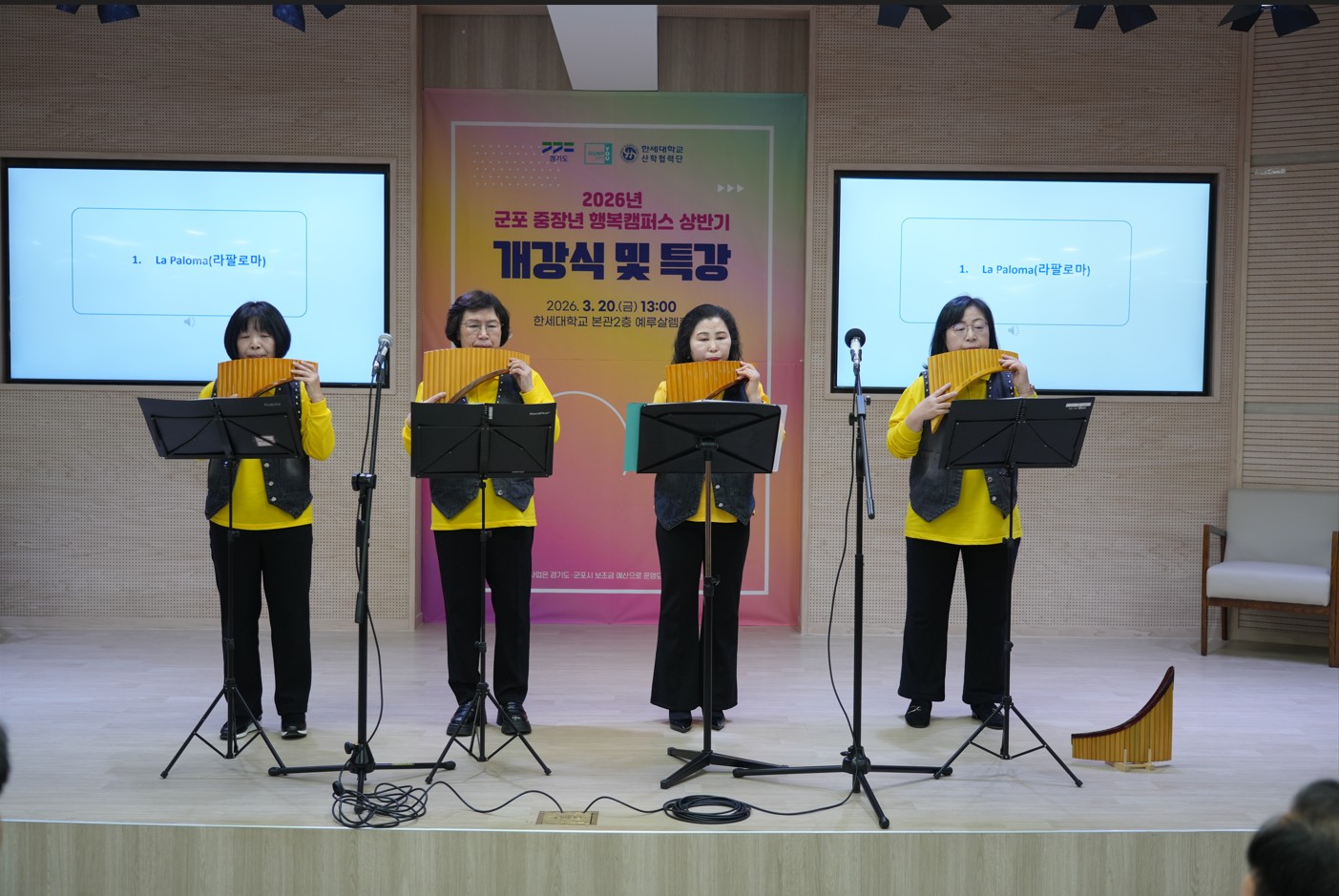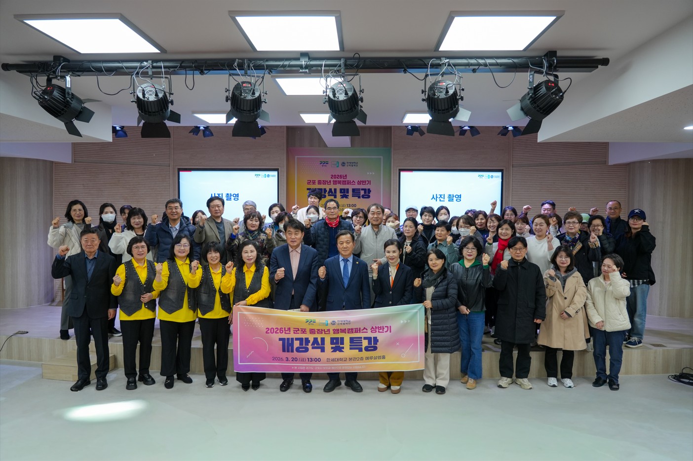 이날 개강 행사는 이경북 팀장(군포 중장년 행복캠퍼스)의 사회로 팬플릇 공연, 최진탁 부총장의 환영사, 하은호 군포시장의 축사 등에 이어 상반기 교육과정 안내 및 직전 학기 회고 동영상 시청 등의 순서로 진행되었고 개강식 이후에는 정상환 강사의 ‘2026년 핵심 트렌드’ 특강 순으로 이어졌다.